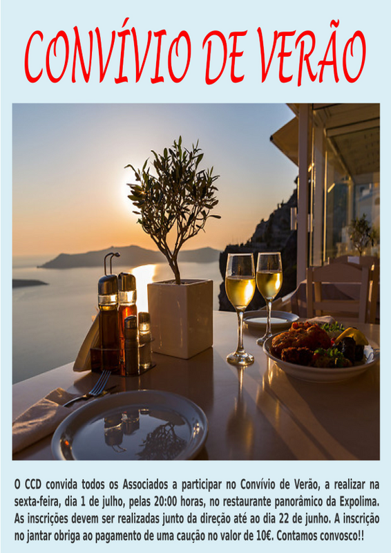 O CCD - Centro de Cultura e Desporto dos Trabalhadores do Município de Ponte de Lima convida todos os associados a participar no Convívio de Verão, a realizar na sexta-feira, dia 1 de julho, pelas 20 horas, no restaurante panorâmico da Expolima.