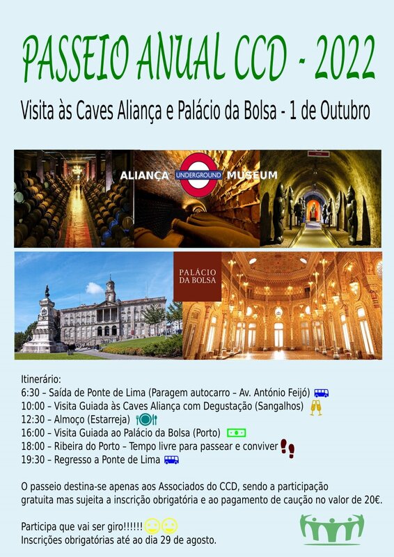 Depois do intervalo de dois anos, onde não foi possível promover algumas atividades, vamos finalmente poder realizar o passeio anual do CCD. Assim, esperamos contar com a vossa presença, para juntos passarmos um dia diferente. O passeio é gratuito mas sujeito ao pagamento de uma caução de 20€, a qual será devolvida no dia. Inscrevam-se até 29 de Agosto junto da direção.