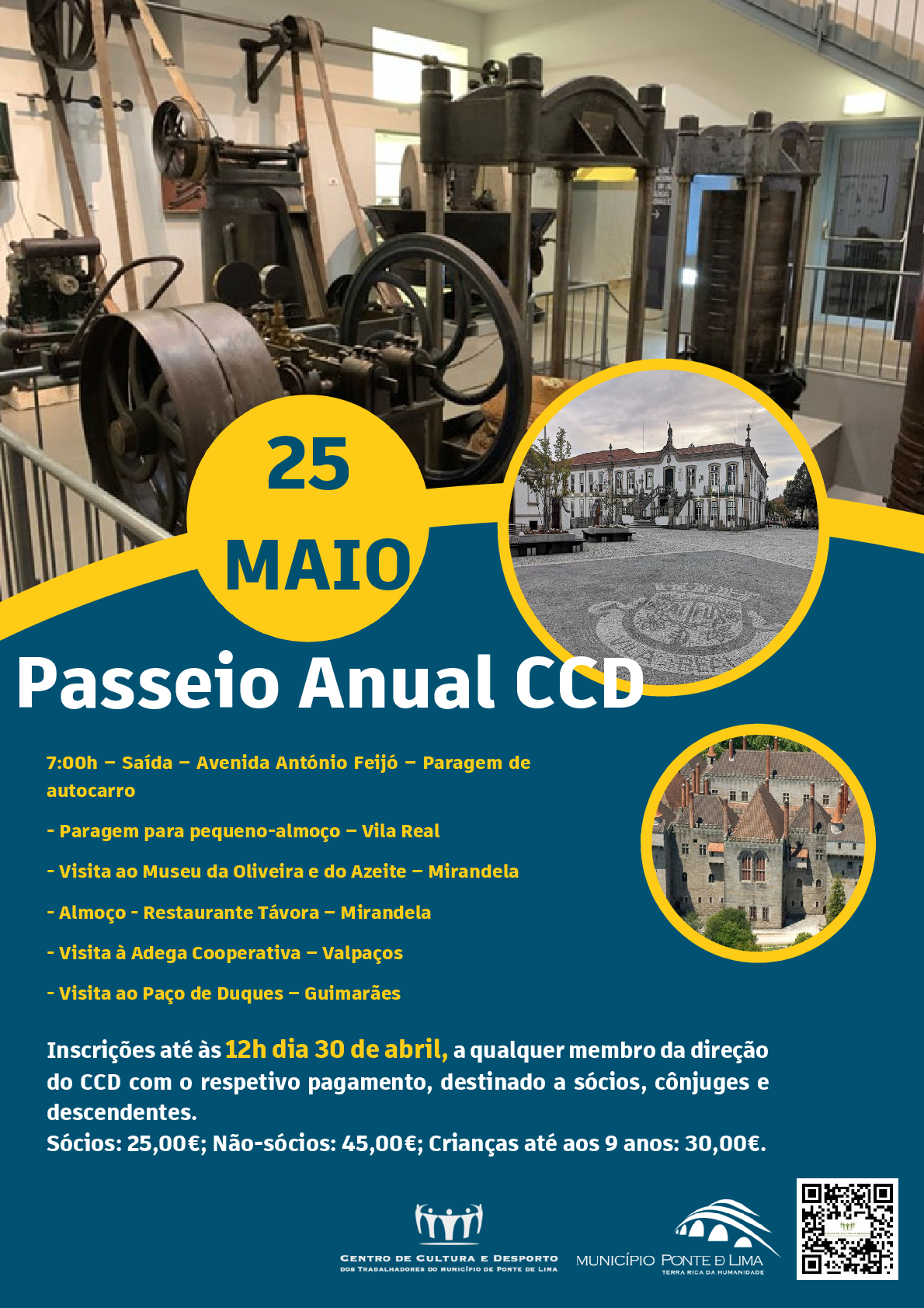 O Centro de Cultura e Desporto dos Trabalhadores do Município de Ponte de Lima informa todos os associados que o Passeio Anual CCD se realizará no dia 25 de maio de 2024 com saída às 7h:00 (obrigatório) junto à Paragem de autocarros da Avenida António Feijó.