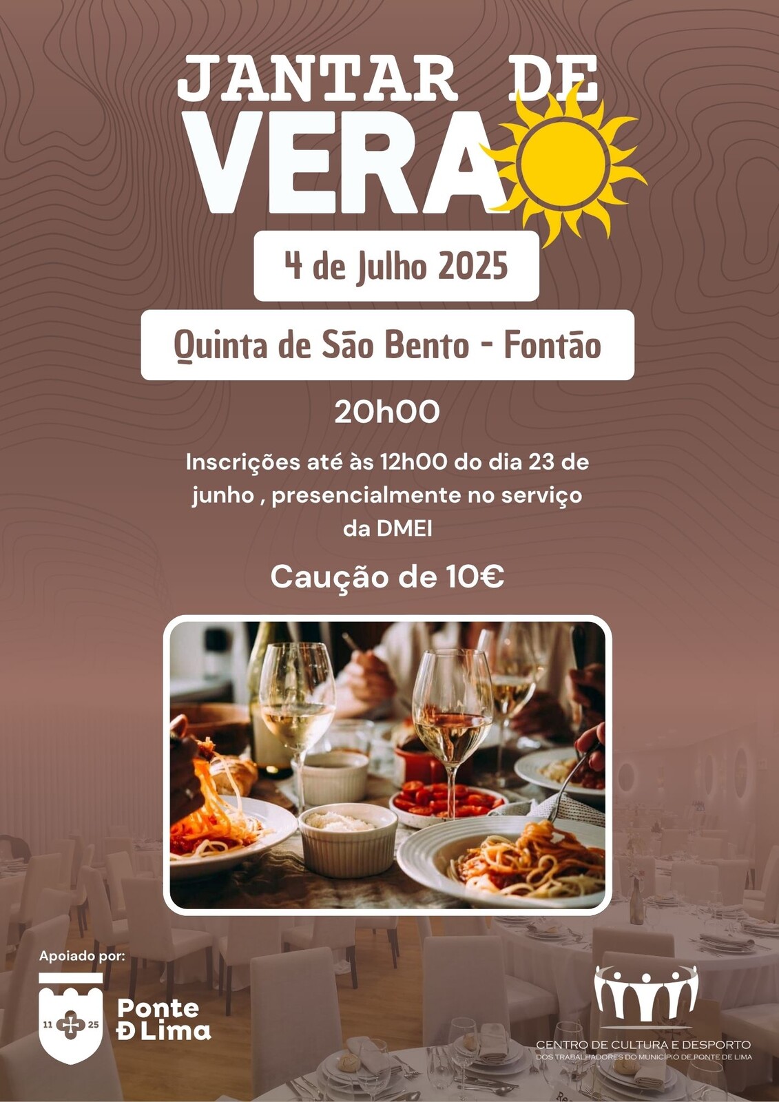 O Centro de Cultura e Desporto dos Trabalhadores do Município de Ponte de Lima convida todos os associados a participarem no Jantar de Verão que se realizará na Quinta de São Bento – Fontão – Ponte de Lima, no dia 04 de julho, pelas 20h00.